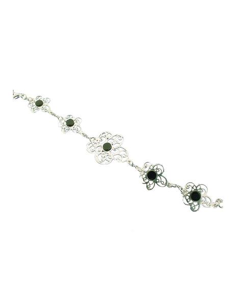 Pulsera con eslabones pequeños y cierre de mosquetón. Cinco flores con piedra redonda de azabache en el centro. Flor central de mayor tamaño.