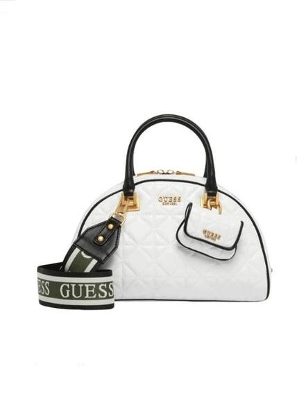 Guess bolso bicolor, blanco y negro con asas pequeñas y tira larga para bandolera. acolchada y con un pequeño monedero-llavero