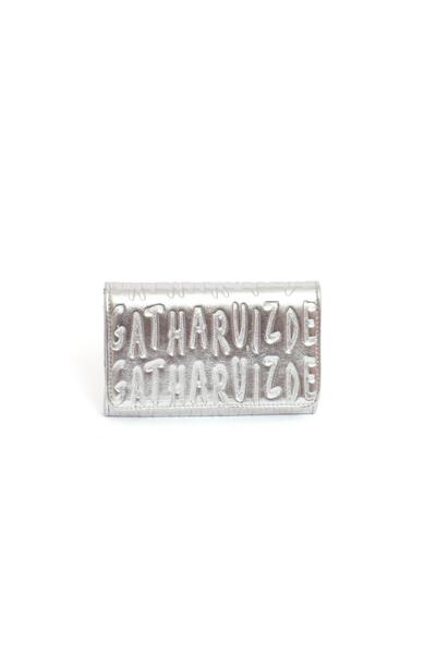 Cartera billetera diseñada en polipiel metalizada con logo de Agatha Ruiz de la Prada grabado. Formato con tapa e interior con muchos compartimentos internos. Interior con bolsillo con cremallera. Dimensiones: 16 × 10 × 3 cm