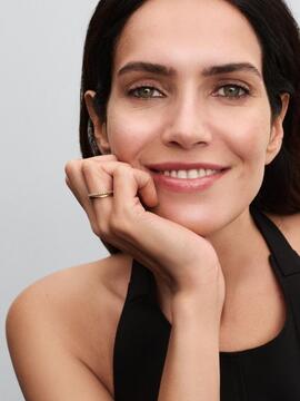 Un diseño audaz y delicado, esta doble banda conectada combina el brillo del pulido con el brillo del pavé. Una joya que combina texturas en un diseño que la hará destacar en cualquier colección de joyas. Circonita cúbica Impecable y refulgente, adorada por su brillo multifacético. Recubrimiento en oro de 14k Duradero y con un cálido brillo dorado. Núcleo de una aleación única de metales.